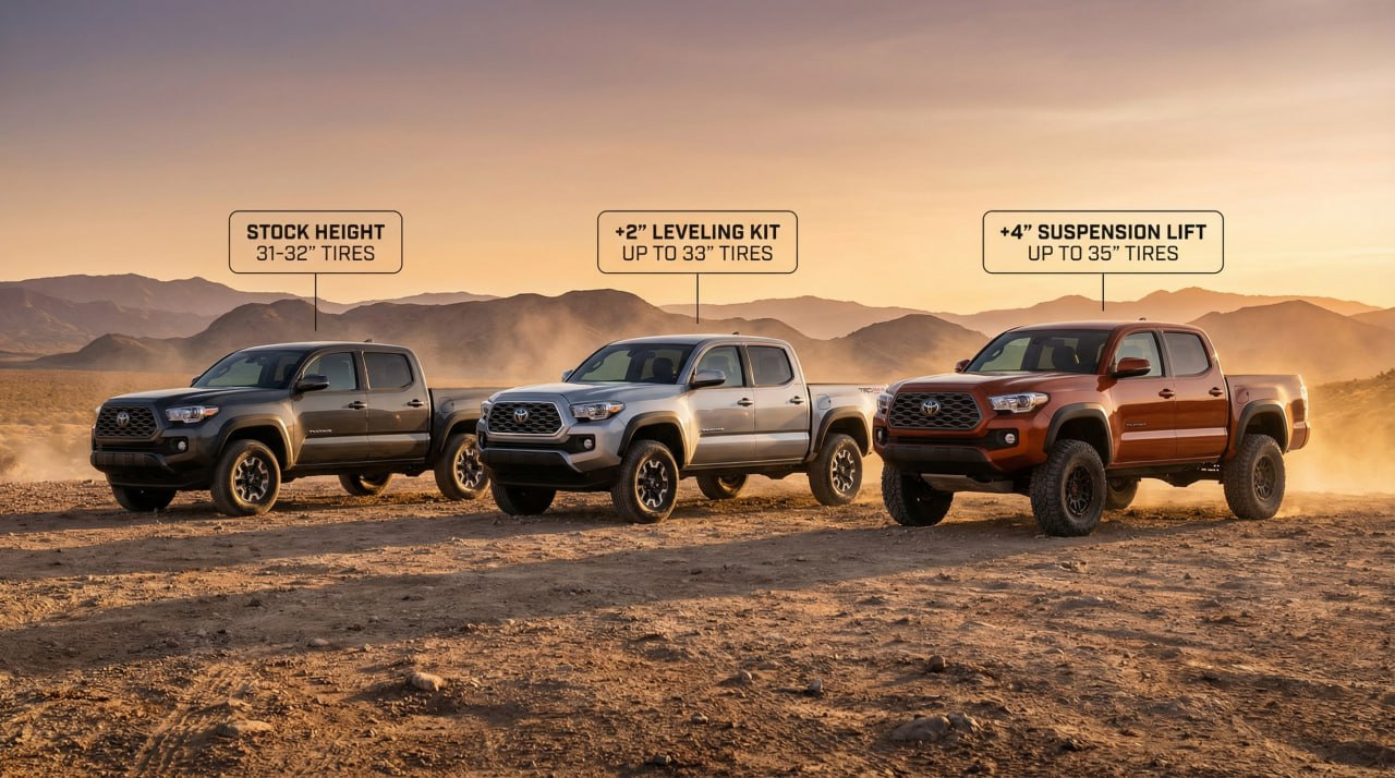 Tire size directly dictates how much lift you need. A leveling kit (1 – 2") clears 33" tires, a 2 – 4" suspension lift handles 35", and 37" tires require a full 4 – 6" lift to prevent fender rubbing and maintain safe suspension travel.